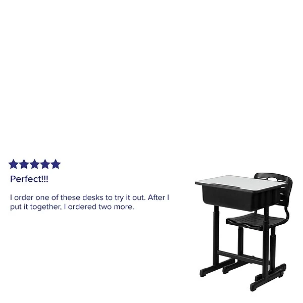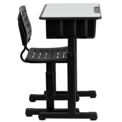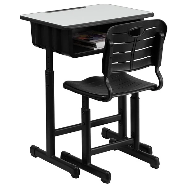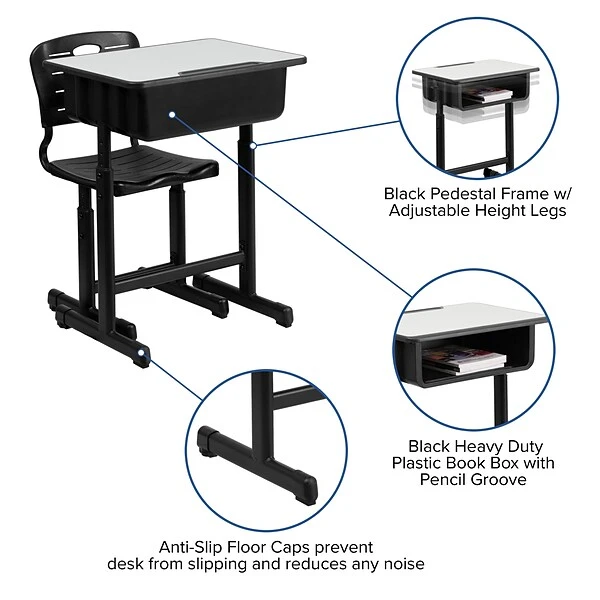 This desk and chair set is a great combination for your classroom seating solution. Both chair and desk are height adjustable to accommodate elementary through high school students. The spacious desktop allows students ample space for books, paper and other items. The pedestal frames feature anti-slip floor glides that prevent it from slipping and also reduces noise. The pedestal frames also provide extra stability around rambunctious children.