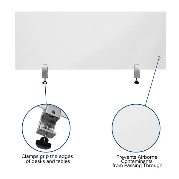Protect employees, students and clients from bacteria and viruses with this clear acrylic desk shield. The use of a sneeze guard partition will help protect your office and teaching staff as well as students and customers by preventing the transmission of droplets. Great for school and office desks, this cough guard will create ways for individuals to have meaningful face to face conversations while helping to mitigate the risks. Adjustable clamps can be easily loosened and remounted in a different location when different configurations are needed. For those in high demand environments in close proximity to others, this shield is a must have. This clear desk shield is transparent to allow first hand discussions essential for student achievement and may help lessen the emotional toll of social distancing. Enable staff and students alike to maintain personal interactions for a more enjoyable work and school day.
