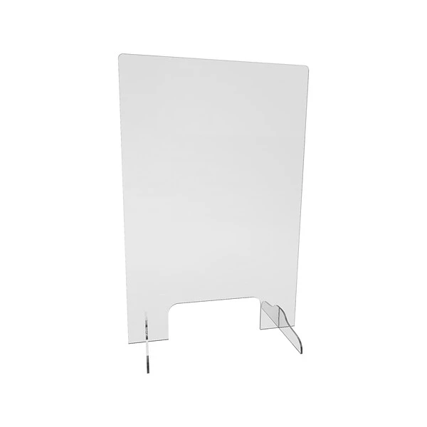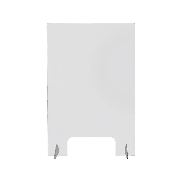 - Freestanding clear acrylic sneeze guard with legs and pass-through (vertical orientation)