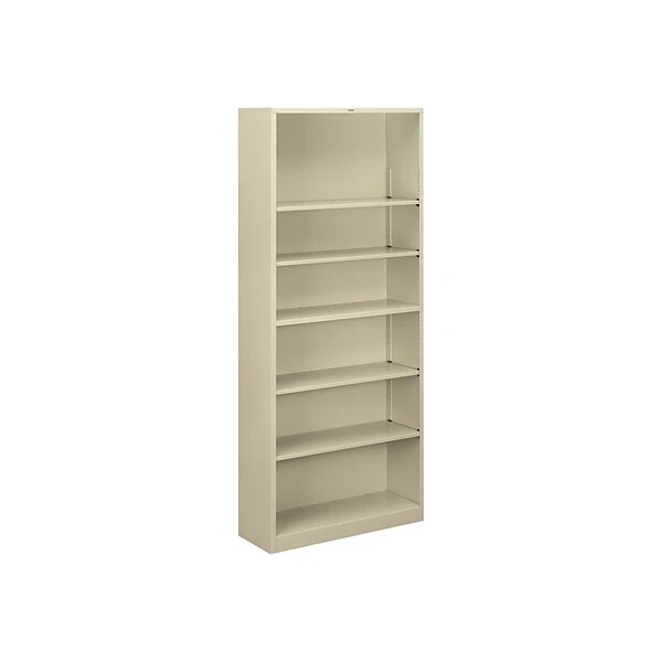 Provide neat organization for office journals, supplies, and records with this steel bookcase. It has a straight, rectangular design that allows easy positioning beside counters or against walls, and the six open shelves offer ample storage. This putty-finished HON Brigade bookcase has a sturdy metal construction that offers stability and durability.