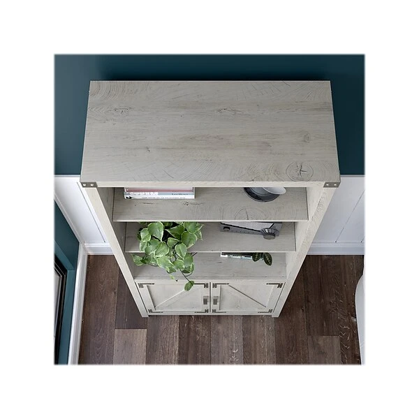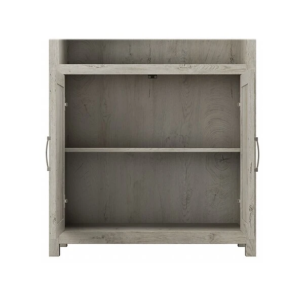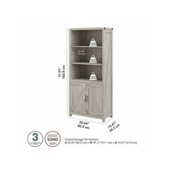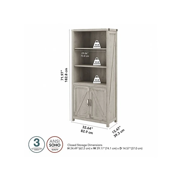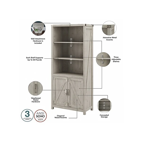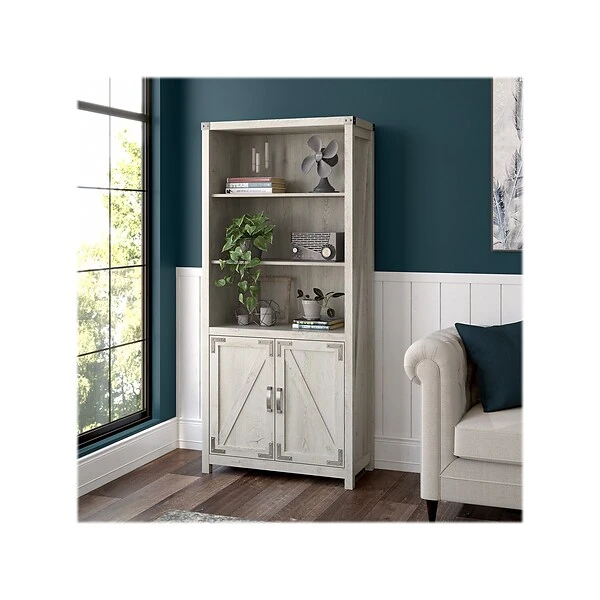 The kathy ireland Home by Bush Furniture Cottage Grove tall five-shelf bookcase with doors offers a practical storage and display solution with appealing modern farmhouse style. Use the top of the bookshelf to brighten up any room with pictures and decorations or organize a collection of paperback and hardcover books. Two of the upper shelves can be raised or lowered to accommodate items of various sizes, and the bottom storage cabinet also contains an adjustable shelf so larger materials can be kept in order but out of sight. Each shelf supports up to 50 lbs. Hardware is included to anchor the bookcase to a wall for maximum stability in your home office, living room, entryway, or any other residential space.