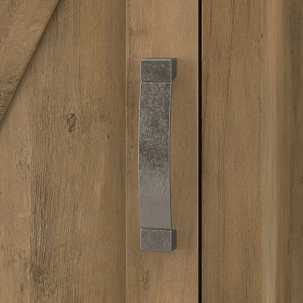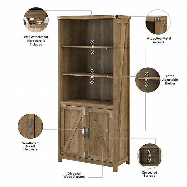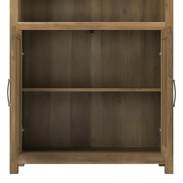 The kathy ireland Home by Bush Furniture Cottage Grove tall five-shelf bookcase with doors offers a practical storage and display solution with appealing modern farmhouse style. Use the top of the bookshelf to brighten up any room with pictures and decorations or organize a collection of paperback and hardcover books. Two of the upper shelves can be raised or lowered to accommodate items of various sizes, and the bottom storage cabinet also contains an adjustable shelf so larger materials can be kept in order but out of sight. Each shelf supports up to 50 lbs. Hardware is included to anchor the bookcase to a wall for maximum stability in your home office, living room, entryway, or any other residential space.