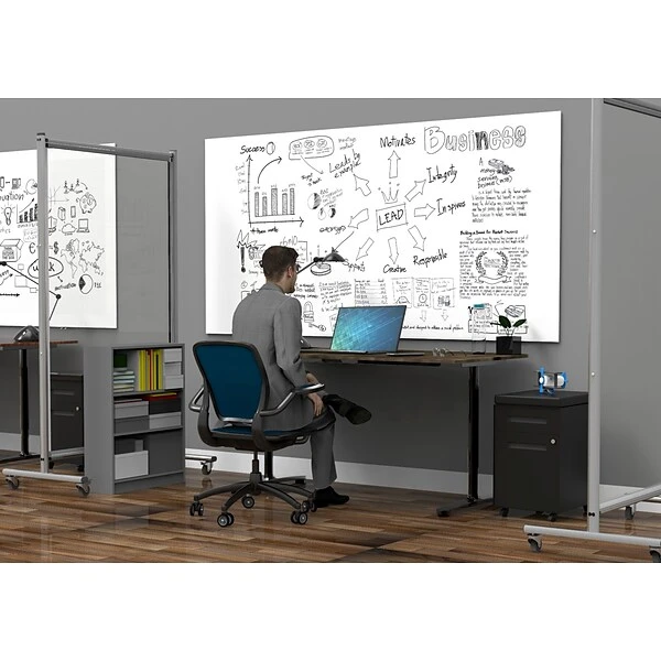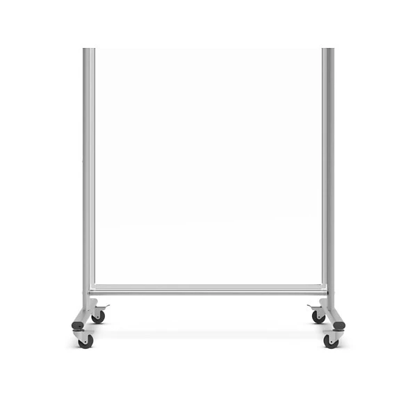 A strong, steel frame with lockable casters makes this plastic barrier easy to move when you need to, yet sturdy and stable when you don’t. Water-soluble markers enable it to double as a dry-erase whiteboard.