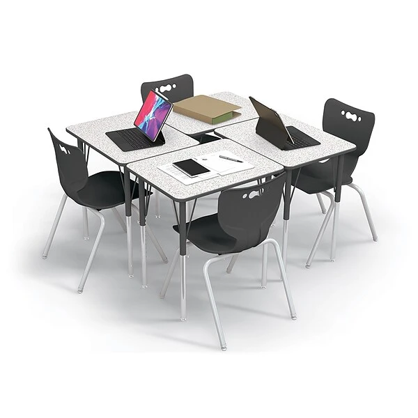 The MooreCo Essentials Economy rectangle desk brings simplicity and functionality in a package made to fit any classroom or school study setting. The desk offers quick and easy assembly, possibilities for numerous group configurations, and height adjustability from 21″ to 30″. Provides flexibility and a comfortable workspace for students. Top available in fusion maple or gray nebula finish with black edge banding, and adjustable powder-coated black steel legs. The legs feature swivel glides. Optional youth height leg insert lowers the adjustment by 6″ to accommodate early childhood users.