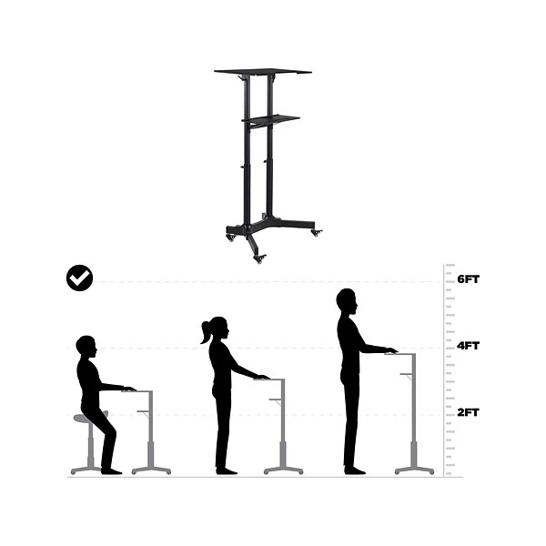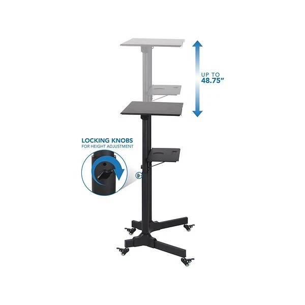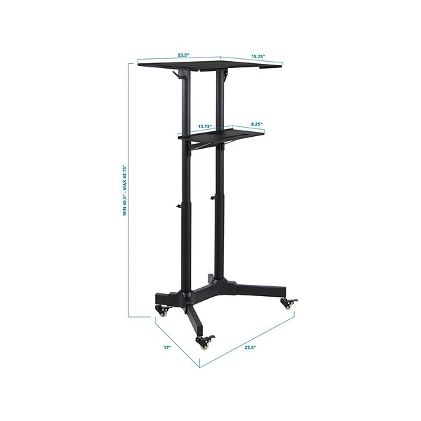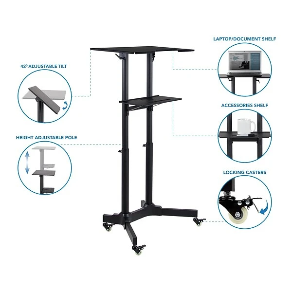 - Features top platform and accessory shelf, can be used as a mobile laptop cart, portable podium, or presentation lectern