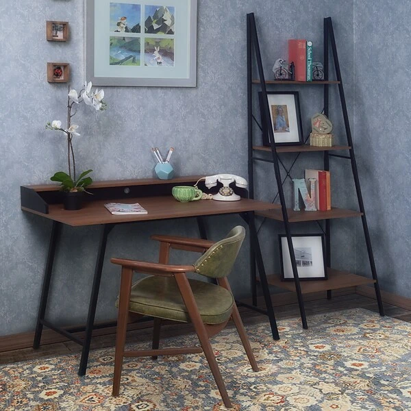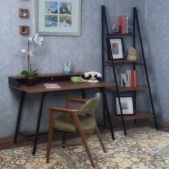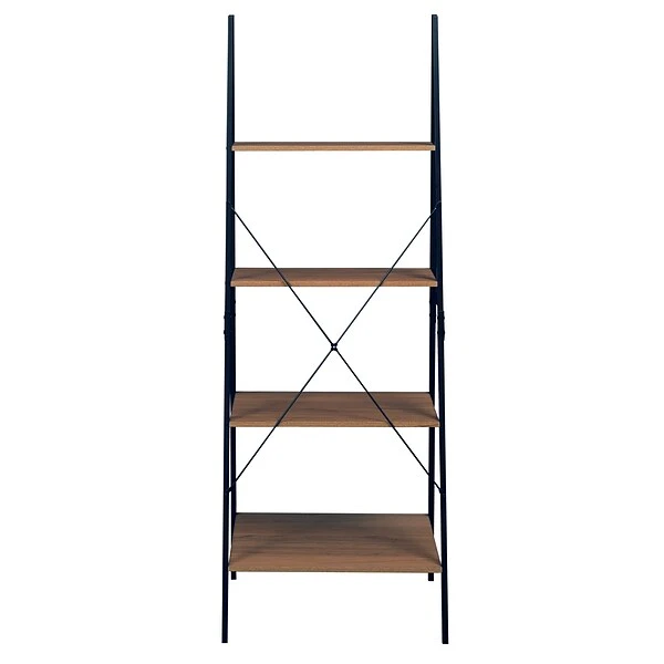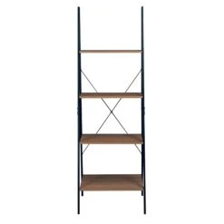 Have the best of both worlds with Niche’s Soho Collection. Combine the modern elegance of an industrial black metal frame with the charm of a rustic woodgrain surface. Its Urban Walnut finish will match any color scheme. This lightweight ladder style bookcase is as versatile as it is stylish. Display decor, store books, craft supplies or use it as a plant stand. It is useful in the kitchen, bathroom, craft room or work area- virtually anywhere! Four fixed shelves sit between a sturdy A-frame with reinforced cross-bracing for extra stability. All shelves measure 22.5″ wide. From top to bottom, the shelves are 6″, 10″, 14″ and 17.5″ in depth. There is 16″ between each shelf. Modern and durable, make this Niche Soho bookcase a part of your home or office today.