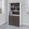 Embrace the unique styling of mid century modern design and enjoy ample storage with the Office by kathy irelandĀ® Method Bookcase Hutch. The modern hutch offers a beautiful and durable titanium finished metal frame. Constructed of 100% thermally fused laminate, the shelves fend off scratches and stains to maintain the attractive design. Organize and display your favorite books, photos and knickknacks on the open shelves. A perfect addition to a professional space, home office or loft, the hutch mounts to the Method Bookcase or Lateral File Cabinet (both sold separately) to provide a complete storage solution. From Office by kathy irelandĀ® and Bush Business Furniture, the Method collection comes with a 6 Year Manufacturer’s Warranty and meets ANSI/BIFMA standards. See the full line of commercial office furniture for coordinating items. American made with U.S. and imported parts.