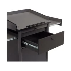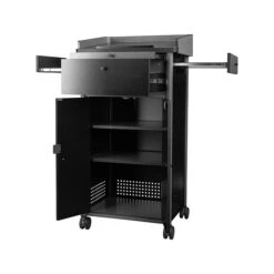 The GSL gray stone lectern from Oklahoma Sound is far more than just a basic lectern. This elegantly designed unit offers an all-in-one presentation experience. A large reading surface (22.75″W x 18.25″L), two side pull-out shelves (14.25″W x 12″L), and a sliding keyboard tray (17.5″W x 9.25″L) provide for a complete multimedia presentation experience. Designer curved gray plywood adds a sophisticated look. The cabinet includes three large shelves plus an oversized front drawer for ample storage. The matching hooded 2.5″ twin-wheel casters makes for easy mobility. Elegance and functionality for all your presentation needs.