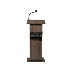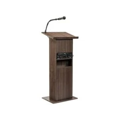 The Oklahoma Sound Power Plus 111PLS-RW is an attractive and affordable sound lectern. Its 30W amplifier is perfect for venues like smaller conference rooms, meeting halls, auditoriums, and cafeterias. The lectern’s large and deep shelf space provides convenient storage. The multimedia capabilities include simultaneous usage with one wireless (optional) and two wired microphones. This sound lectern comes complete with a handheld mic with a 9′ cable and a tie-clip/lapel mic with a 10′ cable. It operates either by an AC plug or with an optional battery and features input jacks for CD players, extension speakers, recording outputs, and playing MP3s. Ships fully assembled.