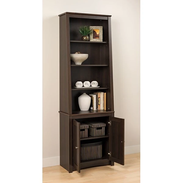 Prepac™ Slant back bookcase with two shaker doors in espresso finish is an ideal addition to your office or living room. Bookcase is constructed from CARB-compliant laminated composite woods which give an elegant look to any room.