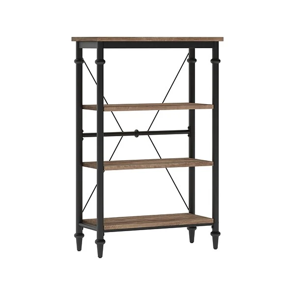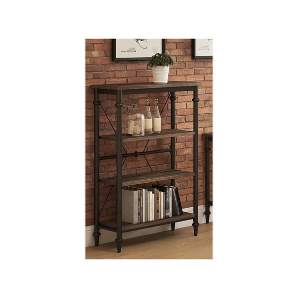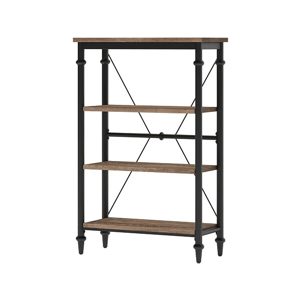 - Standard bookcase features shelves with an antimicrobial crosscut hickory laminate finish to reduce growth of bacteria and black nickel powder coating on sturdy metal legs