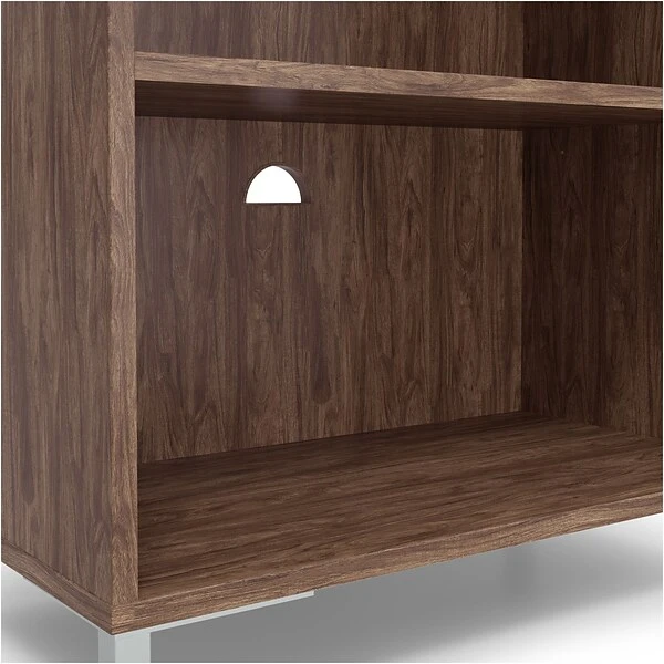 Create fresh, modern efficiency in your small office or cubicle with this three-shelf bookcase. The height-adjustable shelves let you store a multitude of items, while the grommet enables easy cable management, keeping your working space clutter-free. Featuring a small profile, the bookshelf fits well in cubicles or shared office spaces. With a rich finish and a simple silhouette, this Union & Scale⢠Essentials espresso three-shelf bookcase matches other pieces in the line for streamlined productivity.