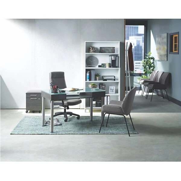 Sort books, binders, trophies and mementos on this five-shelf bookcase. The adjustable shelving lets you create a customized setup, and the large shelves provide ample space for a wide variety of work materials. A cable management grommet keeps cords and wires out of sight, making this bookcase great for a phone, fax or other office electronics. Boasting a crisp white finish, this Essentials five-shelf white bookcase brings a bright, modern look to your space.