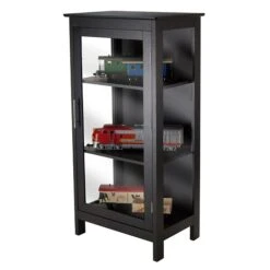 The Poppy Display Cabinet features tempered glass on three sides for easy viewing. Cabinet has three shelves; the top shelf is adjustable. Made of solid and composite wood in a sleek Black finish.
